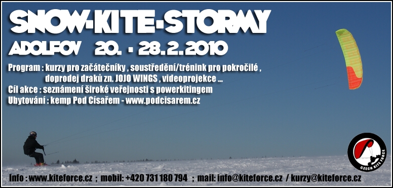 Poslední týden v únoru (20.-28.2.2010) pořádáme na jednom z nejlepších českých snk spotů na Adolfově týdenní soustředění pro všechny nadšence do powerkitingu. Soustředění je koncipováno jak pro úplné začátečníky, kteří budou chtít snowkiting jen zkusit, tak pro pokročilé, kteří mají chuť si zajezdit více než jeden den nebo víkend a zažít tak progres, který jednodenní kiting neumožňuje.